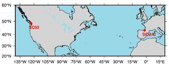 Location of two GNSS reference stations. Both SC02 and SCOA are operated by the EarthScope Plate Boundary Observatory (PBO, https://www.unavco.org/data/gps-gnss/gps-gnss.html (accessed on 22 July 2022)) [33] and Institut National de L’Information Géographique et Forestière (IGN), respectively.