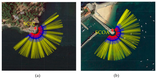Screenshots of the FFZs for site SC02 (a) and site SCOA (b) at elevation angles of 5° (yellow), 10° (blue), and 15° (red), respectively. A fixed reflector height is projected onto the aerial image provided from Google Earth App [36].
