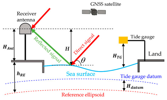 The annual variation in mean sea surface height (MSSH) has been approximately 3.3 mm since the early 1990s, and the rising sea level height caused by global warming has become one of the main slow-onset disasters threatening humankind [1,2]. Accurately monitoring the ocean surface height in the global reference frame and its continuously high-frequency variations is of great significance and value. This can not only can help us to interpret the ocean circulation and physical mechanism of global climate change, but also provide the basic data for developing the global vertical datum. Sea surface heights (SSH) measured by conventional techniques, i.e., satellite altimetry and ground-based tide gauges (TG) [3], have covered most of the global ocean area; however, there are still spatial and temporal gaps and finer-scale variations in tidal height that may be overlooked, particularly in coastal regions. Moreover, the extensive SSH measurements around the world are limited by a decreasing number of TGs and the distorted echo waveforms of altimetry near the coastline. Thus far, the main applications of the global navigation satellite system (GNSS) have been for positioning, navigation, and timing (PNT) services. Focus has been on positioning, navigation, timing, remote sensing, and communication (PNTRC) [4,5]. In recent years, a novel integrated concept of passive remote sensing technique, called GNSS reflectometry (GNSS-R), has been put forward to monitor sea surface characteristics, such as tide [6] and wind speed [7,8], with a low cost, low energy consumption, and large-scale coverage. The GNSS positioning technique can obtain the coordinates of the GNSS observatory and its combination with the ground-based GNSS-R retrievals can measure the absolute SSH parameters.