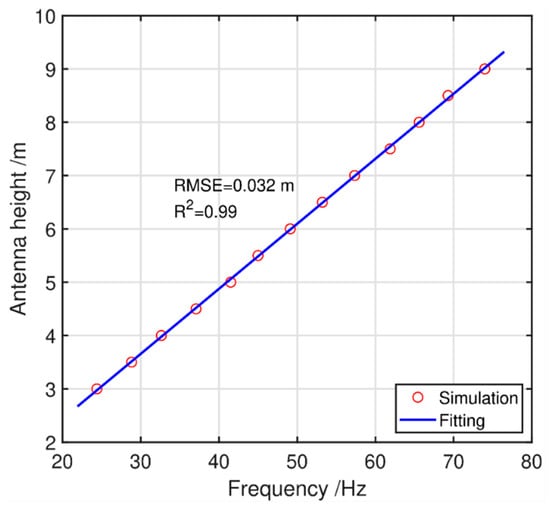 where a and b are the linear fitted coefficients. The linear model between the antenna height and frequency related to the higher peak derived from the simulated observations is presented in Figure 6. Table 3 showed the specific fitting coefficients for different satellite constellations. The parameter of a is approximately equal to half of the higher wavelength for the GNSS DF signal. After estimating the RH for each arc, Equation (4) can convert the RHs into the absolute SSH.
