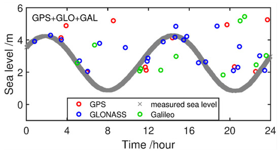 Similar to the study of Larson et al. [19], we limited all RH retrievals to the available range due to this RH range being related to sea surface height. Three steps are used for the combined retrievals derived from multi-GNSS measurements in our study: firstly, the spectral amplitude calculated by the LSP method is a key element. When the ratio of the amplitude peak value to the average amplitude values is above 3, the corresponding RHs are considered significant. As shown in Figure 7, some gross errors should be removed from these remaining RHs. Thus, the second step is a rejection of the gross errors based on the RH results. Specifically, we can divide the daily tidal height dataset into two tidal intervals, i.e., higher tide and lower tide. Then, we calculate the mean and standard deviation of these RHs for each tidal interval, respectively, and those gross errors are rejected outside the confidence interval of . Furthermore, due to the precision of the sea level estimated by the observed arcs with a lower elevation angle being better than that of the observed arcs with higher elevation angle, the minimum value of the elevation angle range for each PE arc should be below 15°.