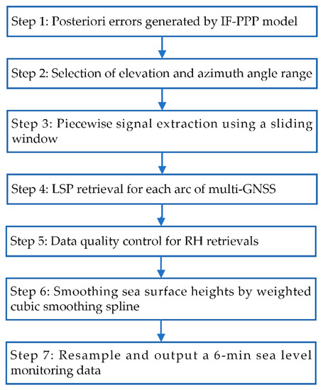 Flow chart of a high-temporal GNSS-IR sea-level retrieval method.