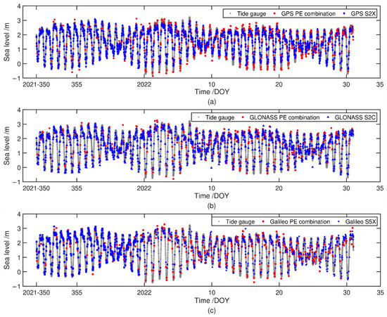 Sea surface height of site SC02 estimated from the PE arcs of multi-GNSS DF carrier-phase observation (red), SNR arcs of the corresponding single-frequency signal (blue), and those measured by the Friday Harbor tide gauge (gray). (a) GPS; (b) GLONASS; (c) Galileo.