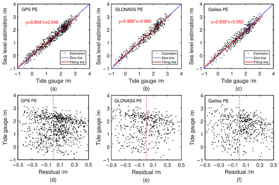 Performance of sea surface height with different GNSS observations for site SC02. (a–c): Linear relationship of sea-level variations estimated from GNSS PE arcs versus the in situ results recorded by tide gauge; (d–f): Van de Casteele diagrams (GNSS-estimated sea-level residuals versus in situ measurements).