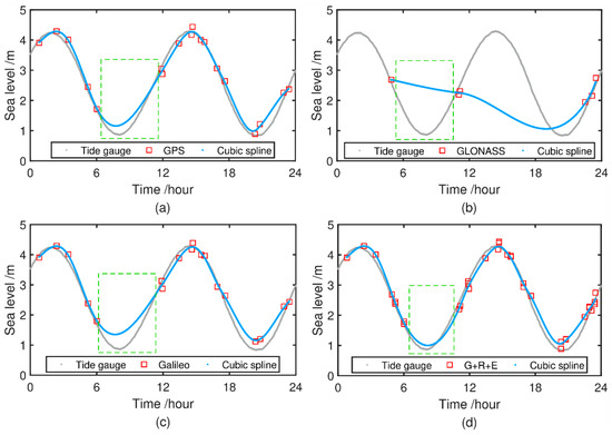 As discussed before, these data quality control steps can guarantee the precision of the combined sea-level retrievals derived from multi-GNSS PE arcs. However, the excessive retrievals within one observation period will cause a considerable redundancy. In principle, a piecewise modeling is a simple solution but results in discontinuities at the nodes. The studies of Hobiger et al. [41] and Strandberg et al. [23] demonstrated that a B-spline function can overcome such deficits but not show enough stability for the initial node or terminal node. To solve this problem, Pan et al. [42] noted that the tidal amplitudes obtained by using a cubic spline interpolation are highly smooth and reject some weak oscillations.