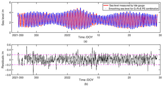 Sea surface heights derived from multi-GNSS PE combination arcs and its residuals with tide gauge. (a) Sea surface height estimation; (b) residuals between the estimations and in situ measurements.