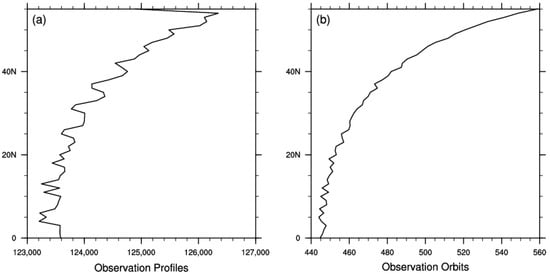 Zonal average sample size over China and its surrounding areas from June 2006 to June 2020. (a) Number of observation profiles. (b) Number of observed orbits.