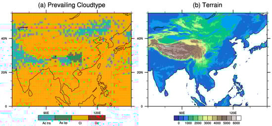 (a) Horizontal distribution of prevailing cloud types throughout the year. (b) The terrain of the East Asia continent.