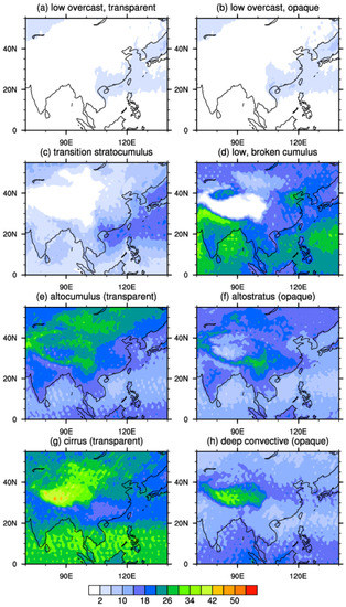 The ratio of the number of cloud samples of each type to the total number of cloud samples is the occurrence frequency of this cloud type. There are also obvious regional differences in the occurrence frequency of the various cloud types. Low overcast (transparent) (Figure 3a) and low overcast (opaque) (Figure 3b) have a similar horizontal distribution of occurrence frequency. They mainly appear on the north side of Balkhash Lake, the eastern and southern coastal areas of China, and the eastern ocean, with a frequency of only 2–6%, and the frequency in other areas is less than 2%. Stratocumulus (Figure 3c) clouds are distributed in all areas except the areas with higher altitudes, and the frequency of stratocumulus is higher over the eastern ocean, up to 14–18%. Low broken cumulus (transparent) (Figure 3d) occur more frequently over the ocean south of 30°N than over land and are more common over the southern slope of the plateau, up to 30%. The occurrence frequency of altocumulus (transparent) (Figure 3e) and altostratus (opaque) (Figure 3f) over the land can reach 26% and is higher than that over the ocean, which is less than 10%. Altocumulus (transparent) clouds are common over 40°N, the Qinghai–Tibet Plateau and its eastern region. Altostratus (opaque) clouds are common around the Qinghai–Tibet Plateau region and the southwest of China. Cirrus clouds (Figure 3g) are the most frequent among the eight types of cloud because the frequency of cirrus is more than 25% in all regions except at latitudes of 20°N–30°N, and the Qinghai–Tibet Plateau is the high-frequency region of cirrus. This is consistent with the research results of Chen and Liu [54], who indicated that there are two independent cirrus active regions over the Qinghai–Tibet Plateau and the Asian monsoon region, one located between the equator and 20°N, and the other over the plateau. Deep convective clouds (Figure 3h) are mainly distributed over the Qinghai–Tibet Plateau and equatorial regions. In general, the frequency distribution of all kinds of clouds is affected by the Qinghai–Tibet Plateau. Except for deep convective clouds, the frequency of low cloud is less than that of medium cloud and high cloud, and the distribution of low cloud and medium cloud shows an obvious sea–land difference. Low cloud is mainly distributed over the ocean, whereas medium cloud is mainly distributed over the land.