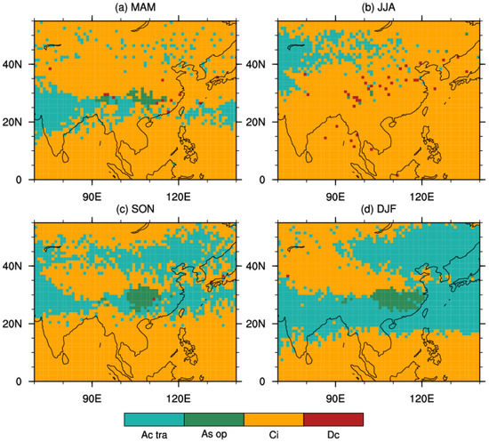 Distribution of prevailing cloud types in different seasons: (a) spring (MAM), (b) summer (JJA), (c) autumn (SON), and (d) winter (DJF).