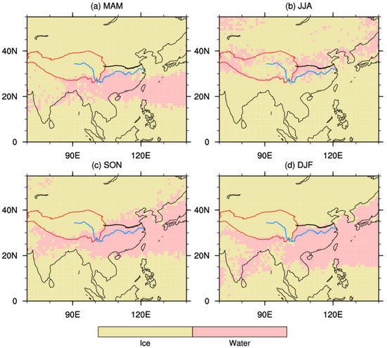 Horizontal distribution of cloud phase in various seasons: (a) spring (MAM), (b) summer (JJA), (c) autumn (SON), and (d) winter (DJF). The red solid line is the Qinghai–Tibet Plateau, the blue solid line is the Yangtze River, and the black thick solid line is the Qinling Mountain and Huaihe river.