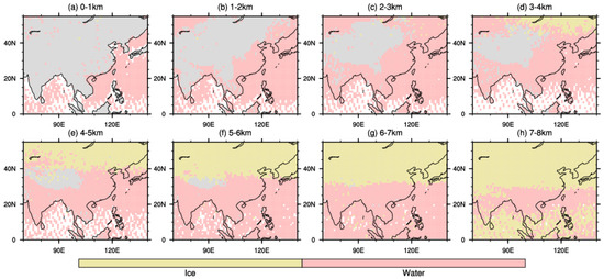Prevailing cloud phases at different altitude layers: (a) 0–1 km, (b) 1–2 km, (c) 2–3 km, (d) 3–4 km, (e) 4–5 km, (f) 5–6 km, (g) 6–7 km and (h) 7–8 km.