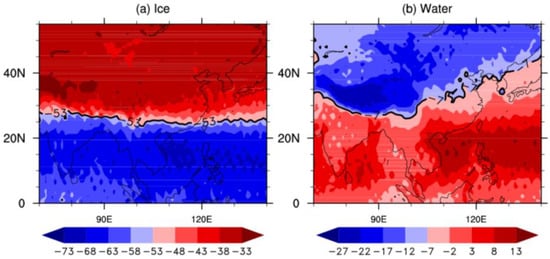 As shown in Figure 14, the horizontal distribution of temperature in ice clouds and water clouds shows an opposite distribution trend from north to south. The valley temperature of the ice cloud is −53 °C, and the isotherm is between 25°N and 30°N. In particular, the temperature in the northern area of the valley-temperature contour is warmer than that in the southern area of the valley-temperature contour. Murray et al. [68] pointed out that water droplets in the Earth’s troposphere are known to supercool to about −37 °C, at which temperature ice nucleates homogeneously on a short timescale. Therefore, Figure 14a may imply that ice cloud formation in low latitudes may be more dependent on a homogeneous process. The valley temperature of the water cloud is −7 °C, and the valley temperature isotherm is located over the south of the western area, distributed along the southern side of the Qinghai–Tibet Plateau, and retracts to about 25°N as far south as possible. The eastern part of the Sea of Japan extends about 45°N to the north. The temperature to the north of the contour line is colder than the valley temperature, whereas the temperature to the south is warmer than the valley temperature. The temperature distribution in the water cloud also shows an obvious difference between the sea and the land. It can be seen that the temperature over the sea surface is warmer, whereas the temperature over the land decreases with increasing altitude, indicating that the temperature in the water cloud is obviously related to the terrain.