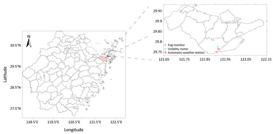 The core port area of Ningbo Zhoushan Port is located between the Beilun District of Ningbo City and the Dinghai District of Zhoushan City, and it is a long and narrow area from east to west. In 2021, the Key Laboratory of Atmospheric Sounding of the China Meteorological Administration (KLAS, Chengdu, China) and the Ningbo Meteorological Network and Equipment Support Center (NBMSC, Ningbo, China) jointly carried out a sea fog monitoring experiment in Meishan Port District, Beilun District. A distribution map of the sea fog observation equipment, namely, the visibility meter (29.78°N, 121.88°E), the fog monitor (29.74°N, 121.9°E), and the automatic weather station (29.76°N, 121.9°E), is shown in Figure 2.