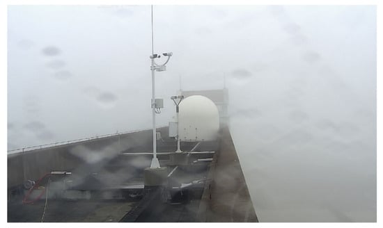A real-time photograph of sea fog at 6:03 (LT) on 15 June 2021 at the port where the droplet spectrometer is located. The lower left corner of the photograph is the fog monitor (FM-120).