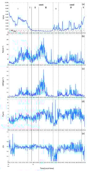 In order to analyze the characteristics of the different stages of the entire sea fog process, we divided the generation and elimination stages in this study according to the change laws of V, NC, LWC, and as follows [23]: (1) Gestation stage: during this stage, visibility changes significantly, and NC and LWC increase from about 0; (2) Formation stage: during this stage, visibility drops below 1 km, and the growth rates of the other three characteristic parameters, such as, NC are low; (3) Development stage: during this stage, visibility continues to decrease, and the other characteristic parameters significantly increase; (4) Maturation stage: during this stage, visibility is maintained at a low value, and each characteristic parameter reaches its maximum value; (5) Intermittent stage: during this period, visibility increases to more than 1 km, and each characteristic parameter remains at a low value; and (6) Dissipation stage: during this stage, visibility increases, and each characteristic parameter decreases.