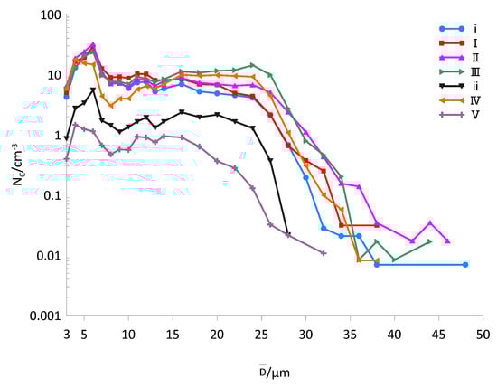 The spectral distribution of fog droplets is another critical parameter that reflects the microphysical characteristics of fog. To study the differences in the microphysical characteristics of case1 and case2 of the sea fog process in Beilun District, Figure 8 shows the droplet spectrum distribution at each stage of the sea fog process in Beilun District from 14 to 15 June 2021. The logarithmic coordinate is used as the ordinate to better reflect the difference in the spectral width of droplets and the density of large droplets at each stage [28]. The high value of the number concentration at each stage is concentrated in the small droplets (diameter between 4 and 6 μm), the droplet spectrum is relatively broad, and the maximum diameter is close to 50 μm, but the number concentration is minimal. Among them, the maximum number concentration of droplets with a diameter of 8–12 μm is observed in the formation stage of case1 (I), the maximum number concentration of droplets with a diameter of 15–27 μm is observed in the maturation stage of case1 (III), and the maximum number of droplets with a diameter of 36–47 μm is observed in the developmental stage of case1 (II).