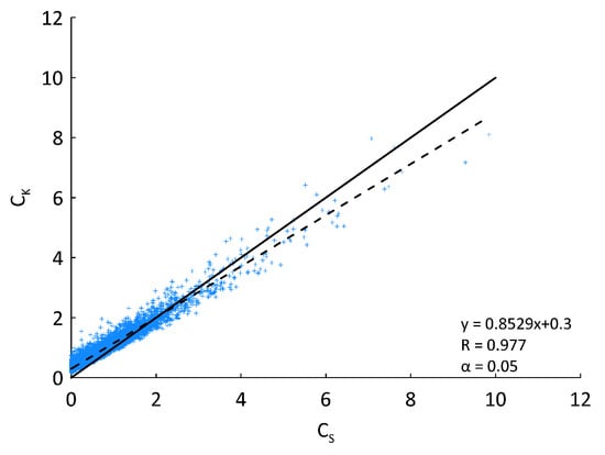 In the study of the microphysical laws of cloud, fog, and precipitation, almost all the problems involve particle scale, which is the most fundamental parameter. The particle swarm is of practical significance, and it is a combination of particle size and number concentration. The droplet spectral distribution function needs to be represented, and the Gamma function can be used to describe it [29,30,31]. In practical applications and theoretical research, using the Gamma function to replace the exponential spectrum in order to approximate the actual spectrum is mainly carried out by employing the direct observation method, which is rarely verified in mathematics. Liu introduced two statistical parameters, skewness (Sk) and kurtosis (Ku), to analyze the actual distribution characteristics of droplet spectra and applied them to a fitting analysis of the droplet spectrum type. When Sk = Ku = 0, the spectrum has a normal distribution; when Sk > 0, it has a positive skewed distribution; when Sk < 0, it has a negative skewed distribution; when Ku > 0, the spectra is leptokurtic; when Ku < 0, the spectra is platykurtic. We introduce CS (skewness deviation coefficient) and Ck (kurtosis deviation coefficient), which give an indication of the deviation of skewness and kurtosis from their values for the M-P distributions [32,33]. Assuming that the particle spectral distribution satisfies the Gamma function, CS = Ck, and we can verify whether the spectral distribution satisfies the Gamma distribution by calculating the CS = Ck of the actual spectrum. Now, we use the data from this sea fog process to calculate CS = Ck and to draw a scatter plot (Figure 9). It can be seen in the figure that most of the scatter points are near the straight line y = x, indicating that the droplet spectrum distribution roughly conforms to the Gamma distribution. Comparing the droplet spectrum distributions of the sea fog between different regions, it is obvious that they are different from the monotonically decreasing types in Zhanjiang, Maoming, and Qingdao. Among them, the droplet spectra in Zhanjiang and Maoming conform to the Junge distribution [34,35], and the droplet spectra in the coastal areas of Zhoushan and southern Fujian conform to the Deirmenjian distribution [36,37]. However, the spectral droplet distribution of the sea fog process in Zhanjiang from 20 to 21 March 2011 satisfies the Gamma distribution [38].