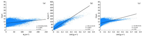 The correlation analysis of the two parameters in the Beilun district from 20:55 on 14 June to 7:20 on 15 June 2021. (a) (μm) and NC (cm−3), (b) NC (cm−3) and LWC (g m−3), (c) (μm) and LWC (g m−3).