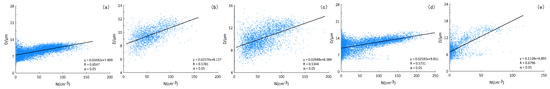 Correlation analysis between (μm) and NC (cm−3) in the case1 process, gestation stage, and intermittent stage. (a) Gestation stage, (b) formation stage, (c) development stage, (d) maturation and dissipation stage, (e) intermittent stage.