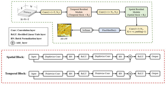 The modules and are used to learn efficient spatial–temporal features in X, based on which the (pixelshuffle) layer is added to obtain high-resolution label maps. There are two options available in the layer, i.e., spatial interpolation layer and pixelshuffle layer, both of which can improve the feature resolution.