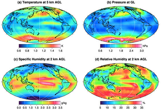- Kursinski, E.R.; Hajj, G.A. A comparison of water vapor derived from GPS occultations and global weather analyses. J. Geophys. Res. 2001, 106, 1113–1138. [Google Scholar] [CrossRef]