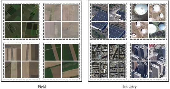 Intra-class differences and aggregation on RSSCN7. The solid boxes show the images of the field and the industry class, respectively. It can be found that in the same class, the features of samples in the same dotted box are similar, while the features of samples in different dotted boxes are relatively different.