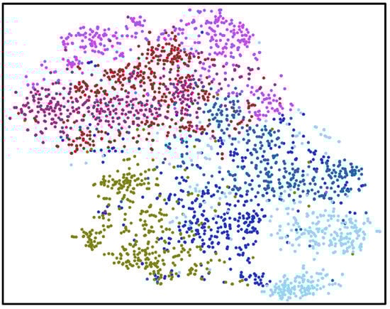 The t-SNE visualization on RSSCN7. The points in the figure represent samples and different colors represent different classes. It can be found that the samples of the same classes are scattered, and show a local aggregation.