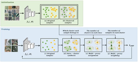 The AMP method framework. The top half of the figure is the initialization module, and the backbone network maps the sample features into the embedding space, as shown in (a). The yellow and green in the figure represent two classes of samples, the gray-shaded parts are the clusters after performing the clustering algorithm, as show in (b). The lower half of the figure represents the training phase. (c) shows the initial training data in a batch. We synthesize the samples intra-cluster within the batch based on the information obtained in the initialization phase, and the dashed border indicates the synthesized samples, as shown in (d). After the synthesis phase, we assign a proxy to each cluster to express the intra-cluster features. The triangle in (e) represents the proxy, the square in (f) represents the overall features of the class, and the thickness of the line between the square and the triangle represents the weight of the proxy.