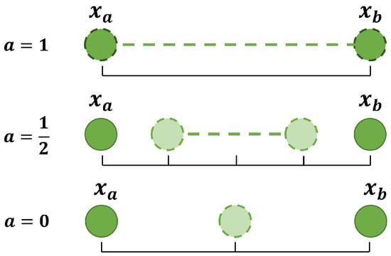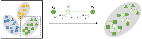 where r is a random number in the range of and denotes the synthesis method executed on samples , . In addition, in order to control the randomness of the synthesis, we design the parameter a to regulate the degree of randomness. A larger value of the parameter a indicates a larger range of synthesis locations, i.e., the degree of randomness is higher. A smaller value of the parameter a indicates a smaller range of synthesis locations and the position of synthesis is closer to the midpoint of , , i.e., the degree of randomness of synthesis is lower.