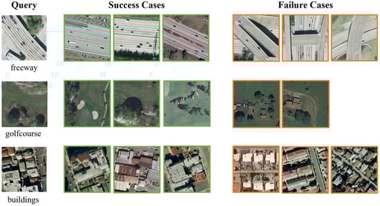 Figure 14, Figure 15, Figure 16 and Figure 17 show the success and failure retrieval cases (in no particular order) in the four datasets. It can be seen that the similarities between some images of certain classes in these datasets are greater and the feature distributions are more similar. For example, freeway and runway, buildings, and dense residential in the UCMD dataset. Our method is prone to misclassification for such datasets, and we believe there are two main reasons for this. First, the feature extraction network (bn-inception) we use has difficulty in extracting discriminative features between these samples. Second, the advantage of the multi-proxy structure is that it can better extract features in the data with large intra-class variance. However, for some samples with single features, such as the bare land and farmland classes in the AID dataset, our multi-proxy structure cannot play its advantages.