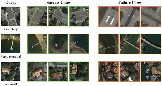 Examples of RSSCN7 retrieval results. Column 1 is the query sample, columns 2–4 are the success cases of our method, and columns 5–7 are the failure cases.