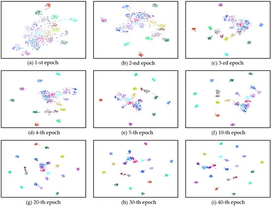 A t-SNE visualization of the proposed method. (a–e) are the t-SNE visualizations of the first five epochs of all classes in the dataset UCMD. (f–i) are the t-SNE visualizations at the 10th, 20th, 30th, and 40th epochs, respectively. Different colors in the diagram represent different classes.