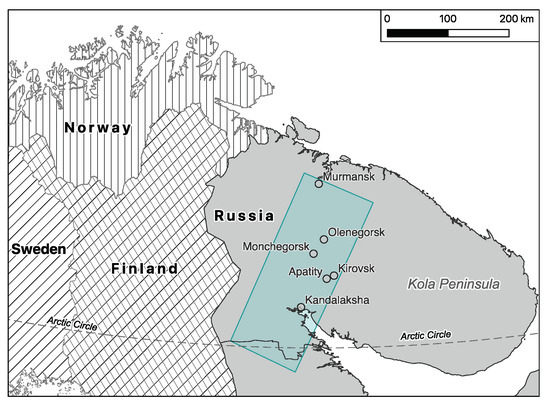 Location of the study area in the Kola peninsula, Russia, together with main settlements. The rectangular area of approximately 37,000 km was selected for the detailed analysis as an area with high concentration of industrial activity and high quality of satellite data (low cloudiness). It lies almost completely beyond the Arctic Circle.