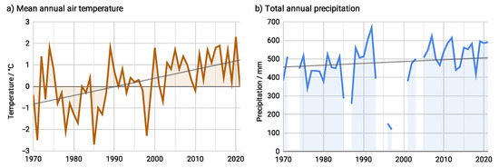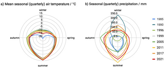 Based on the meteorological data, we observe statistically significant trends of increasing air temperature and precipitation in the 50-year period from 1970 to 2021. The mean air temperature (Figure 3a) rose from about –0.9 °C at the start of the 1970s to about +1.2 °C at the end of the 2010s ( with , according to the Mann–Kendall test [26]). Interestingly, the winter temperatures increased more significantly than the summer ones. We also observe an increase in the total amount of warmth that supports vegetation growth (computed as a sum of the daily mean temperatures above a selected cutoff value). For the cutoff of +5 °C, the increase from 1970 to 2021 is around 20% based on the data by Veselov et al. [27]. The amount of the annual precipitation (Figure 3b) rose about 10%, from around 460 mm in 1970 to around 505 mm in 2021 ( with ). The increase in the average air temperature and the amount of precipitation resulted in an earlier onset of the vegetation green-up and to a longer duration of greenness. This is why we expect a higher density and productivity of forests, as well as increased volumes of phytomass towards 2021 [28,29].