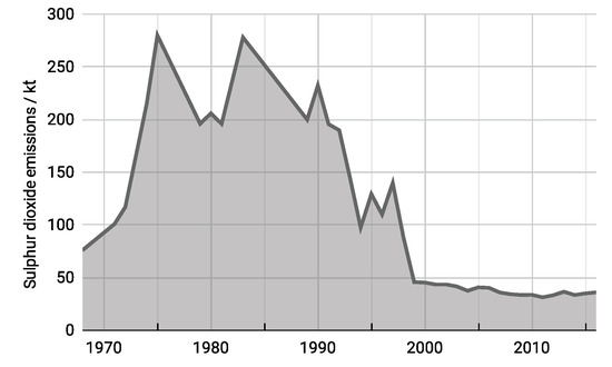 Development of sulphur dioxide (SO) emissions from the Severonikel smelter [45,46,47]. Similarly to Figure 3, we use a wider range of dates to demonstrate the long-term trend.