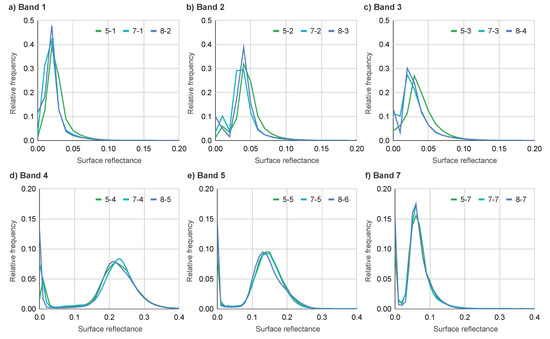 Characteristic histograms of Landsat Level-2 products in bands 1–5, 7 for Landsat-5/7 and the corresponding bands 2–7 for Landsat-8.