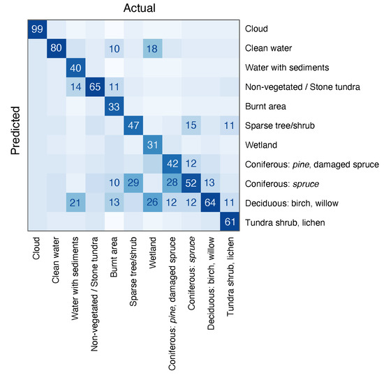 The classifier confusion matrix is shown in Figure 6. The accuracy of the model was assessed over the testing dataset and, after fine-tuning the classifier parameters, constituted 63% in the cross-validation over 11 classes (up from 60% with the default parameters). Most classes are accurately reproduced in the training dataset (with an accuracy of >60%). The highest levels of confusion are observed between wetland and deciduous vegetation and between spruce and pine coniferous vegetation. Both misclassifications are expected due to similar spectral properties of wetland and sparse deciduous cover, and coniferous cover, respectively.