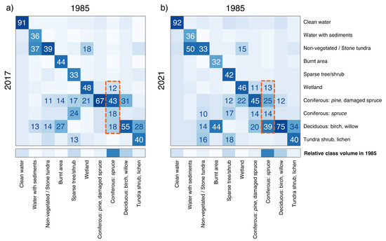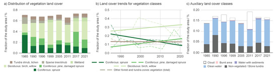 To assess the qualitative and quantitative changes in the boreal vegetation of the central part of the Kola peninsula over 35 years, we computed eight land cover classification maps for the years 1985, 1990, 1996, 1999, 2005, 2011, 2017 and 2021 (Figure 8).
