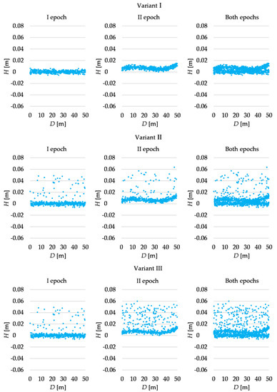 The obtained values indicate that the estimation based on the combined observation sets provides much less accurate results than when processing each epoch’s observations separately. It may seem that SMS and AMS estimation cannot handle outliers. However, one may notice that the results obtained in Variant I are also very poor. This means that the magnitude of the terrain displacements is not enough to make the “separation” between regular observations from the first and second epochs easily detectable.