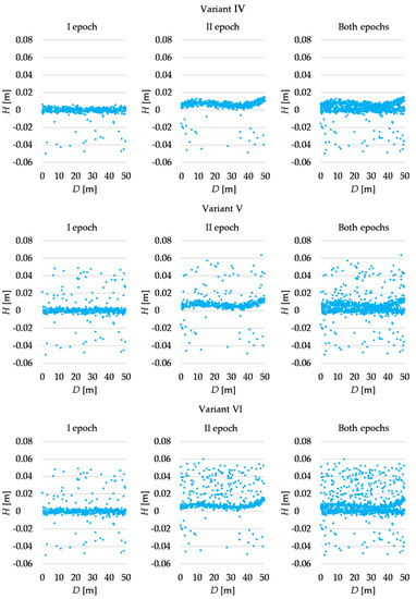 The numerical tests showed that the second possible approach, namely processing one combined observation set, should not be used in the cases of the observation sets simulated here. As mentioned, the separation between the subsets is not so evident; hence, Msplit estimation variants could not separate the subsets successfully. Additionally, at distances from 30 m to 40 m, the terrain profiles from both epochs are very close to each other. Thus, it is difficult to “determine” whether the profiles cross or if one is always above the other (such a disadvantage does not appear in processing each epoch separately). In conclusion, the estimation process is disturbed, resulting in the low accuracy of the outcomes. The exception is the results for AMS estimation for Variants II and IV, which seem rather satisfactory. This results from the location of outliers (they are all positive or all negative). Thus, all outliers are assigned to the regular observations from the second epoch (Variant II) or the first one (Variant IV), and AMS estimations “have” less trouble with distinguishing observations from different epochs (especially at the distances 30–40 m).