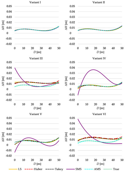 The estimates of the polynomial coefficients allow us to compute each epoch’s estimated profile heights (every meter). One can obtain the terrain displacements at the chosen points by subtracting the respective point heights. Figure 3 presents the height differences between the measurement epochs, namely the estimation results obtained for all variants and methods applied when the observations from two measurement epochs are processed separately. All estimation methods provide similar and correct results for the two first variants. The differences between the methods appear in the four subsequent variants (see Section 4).