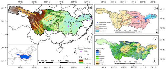 The Yangtze River Basin (YZRB): (a) location and elevation; (b) subbasins; and (c) vegetation types.