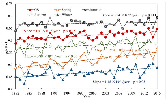 The spatiotemporal variations in vegetation in the YZRB at different time scales were investigated. Note that the GS in this study was defined as from April to October [64], and the four seasons were spring (March to May), summer (June to August), autumn (September to November), and winter (December to February). Figure 2 shows the NDVI interannual variations in the YZRB. The NDVI showed increasing trends during the 1982–2015 period at all time scales. The GS-NDVI values in the YZRB fluctuated between 0.58 and 0.65 and increased significantly at a rate of 1.01 /yr. The seasonal NDVI values were ranked as summer > autumn > spring > winter. Vegetation showed significant greening trends (p < 0.05) in spring, autumn, and winter and a slight upward trend in summer. The seasonal NDVI trends were in the order of spring (1.98 /yr), winter (1.18 /yr), autumn (0.89 /yr), and summer (0.34 /yr).