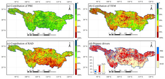 Contribution of climate variables to the VSI in the YZRB: (a) precipitation (PRE), (b) temperature (TEM), (c) solar radiation (RAD), and (d) the primary drivers controlling the VSI.