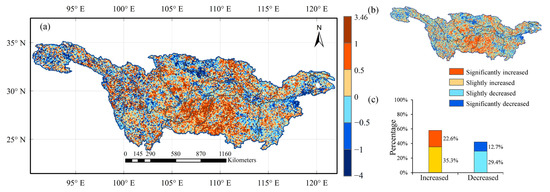 In this study, the linear least squares regression method was utilized to investigate multiple time scale linear trends of the NDVI at pixel and regional scales [56]. The Theil–Sen median analysis combined with the Mann–Kendall test, which has been extensively used to analyze long-term sequences of vegetation in previous studies [5,65,66], was also chosen to determine the statistical significance of vegetation changes. On the basis of previous studies [13,65] and the real conditions in the YZRB, the statistically significant results were categorized into five types: significantly improved (SNDVI ≥ 0.0005, Z ≥ 1.96), slightly improved (SNDVI ≥ 0.0005, −1.96 ≤ Z ≤ 1.96), stable (−0.0005 ≤ SNDVI ≤ 0.0005), slightly degraded (SNDVI ≤ -0.0005, −1.96 ≤ Z ≤ 1.96), and significantly degraded (SNDVI ≤ −0.0005, Z ≤ −1.96).