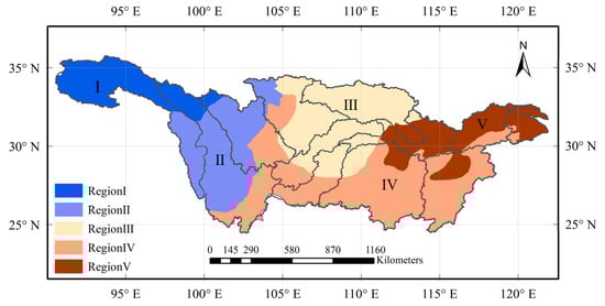 To explore essential triggers of spatial heterogeneity on vegetation dynamics and their response to climate, K-means clustering analysis was used to divide the YZRB into several homogeneous subregions. To reduce the heterogeneity and discontinuity within the subregions, some subjective adjustments [68] were conducted after obtaining K-means clustering results based on the different types of properties. The adjustments included moving pixels from one subregion to another, deleting some pixels from a subregion, subdividing a subregion, eliminating a subregion, and combining two or more subregions (Figure S5). These adjustments have been used in many other regionalization studies with a large number of stations or grids [69,70]. Eventually, a more reasonable and consistent regionalization result was obtained and the YZRB was divided into five subregions (Figure 7), covering the source region of the YZRB (Region I), the Hengduan Mountains (Region II), the north-central YZRB (Region III), the south-central YZRB (Region IV) and the northeastern YZRB (Region V).
