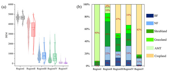 The elevation ranges and the percentages of vegetation types in different subregions shown in Figure 8 indicate that the subregion divisions and the distributions of elevation and vegetation types were consistent. The elevation in Region I was the highest among all subregions, with a mean value of 4650 m. The elevation values had a concentrated normal distribution, with a range of 4000–5300 m. In Region II, the mean elevation was 3400 m, and the distribution of elevation was leftward and discrete, ranging from 950 m to 4950 m. Regions III and IV both exhibited rightward distributions of elevation with a similar dispersion, while Region V had the lowest and most concentrated elevation with a mean value of 70 m. According to the percentage of different vegetation types in different subregions (Figure 7b), the vegetation in Region I was dominated by AMT (92%), whereas Region II was dominated by shrublands (40%) and complemented by forests (31%). However, vegetation in Regions III and IV was interspersed with croplands, shrublands, and forests, while 82% of the vegetation in Region V was croplands.