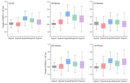Boxplots for the GS and seasonal NDVI trends in subregions: (a) GS, (b) spring, (c) summer, (d) autumn, and (e) winter.