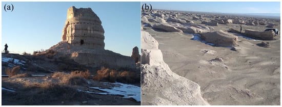 18]. Moreover, over the past 2000 years, among the 38 ancient cities abandoned through desertification in the Hexi Corridor, 21.05% were abandoned during the Wei, Jin, and North–South Dynasties, 21.05% were abandoned during the end of the Tang and Five Dynasties, and 57.9% were abandoned during the Ming and Qing dynasties [